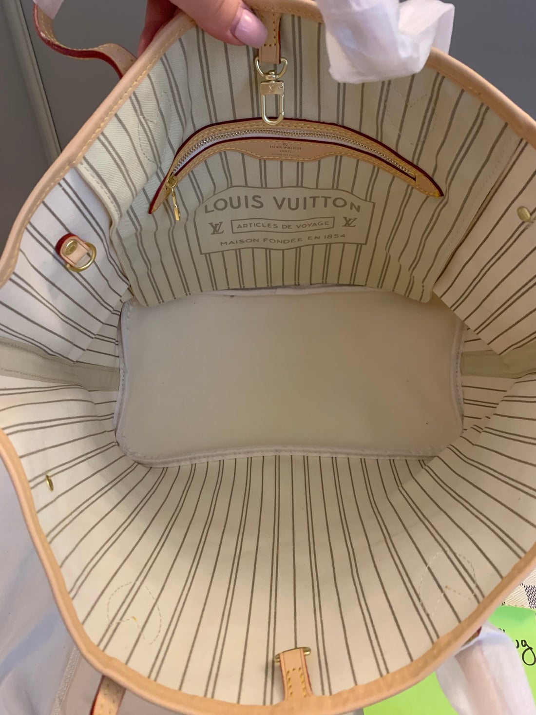 Handmade Leather Handbag Neverfull MM in Damier Azur available in beige or pink interior, includes the matching leather clutch, arrives in a dust bag.